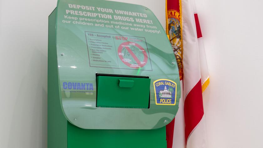 The drop-off bin is located in the lobby of the new Coral Gables Police and Fire Headquarters located at 2151 Salzedo Street. Individuals can drop off their expired/unwanted prescription drugs 24 hours a day, 7 days a week.