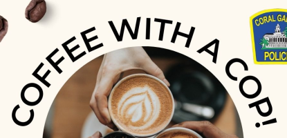 Coffee with a Cop July 24, 2025 Target, 1906 Ponce de Leon Blvd, Coral Gables, FL 33134 Start your day off right at Coffee with a Cop on Thursday, July 24, from 9:30 to 11:30 a.m. at Target, 1906 Ponce de Leon Blvd. Enjoy complimentary coffee and light snacks as you meet your local police officers.