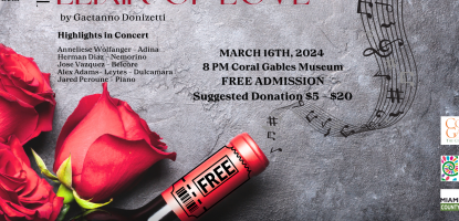 Come share a Saturday evening of music and love with Florida L'Opera and Zarzuela. Enjoy some of the best moments of The Elixir of Love, an Italian Opera classic by Gaetano Donizetti! The show features local and international artists Anneliese Wolfanger as Adina, Herman Diaz as Nemorino, Jose Vazquez as Belcore, Alex Adams-Leites as Dulcamara, and Jared Peroune in the Piano.