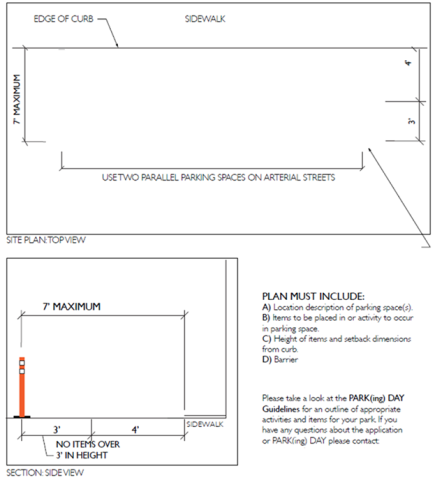 A site plan must be submitted for your park so that we know what you’re planning. This doesn’t need to be fancy and it’s okay if you’re not an engineer, architect, or artist. The site plan should follow the instructions outlined in the Park(ing) Day Application and must include: