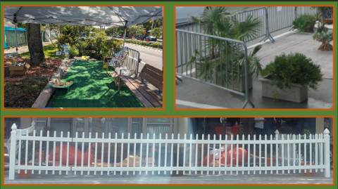 Barriers will be provided by the city and are required to mark the boundaries of your park and clearly identify the edge of the traffic lane and adjacent parking spaces. The barriers must be at least 36” tall. Large planters will be considered. Your park must stay within its approved parking space(s). See examples below: